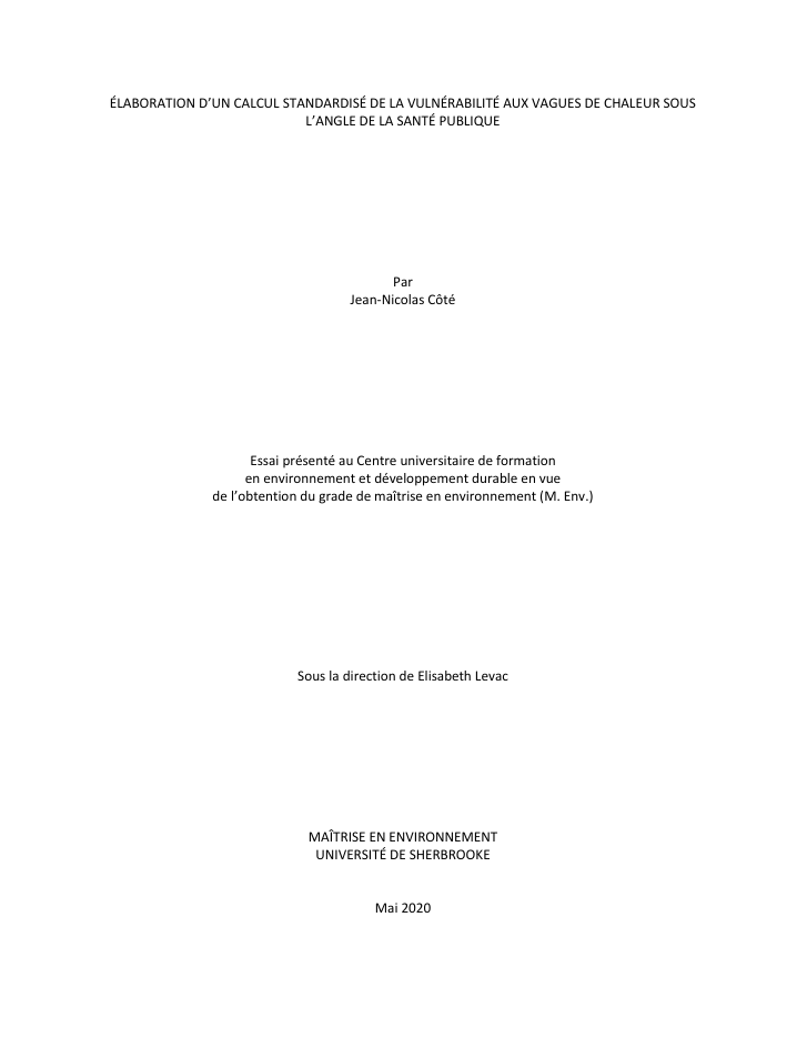 In order to decrease the deleterious impacts of climate change on vulnerable communities, it is essential to well quantify this phenomenon to adopt the appropriate strategies. A lot of adaptation plans to climate change rely on matrices to establish vulnerability, but those are succinct and lack precision. This assessment can be optimized with an approach that combines geographic information systems and a principal component analysis. The heat wave hazard and its consequences on public health has been chosen to study the equation V = S – AC, where V is the vulnerability, S the sensitivity and AC the adaptive capacity.